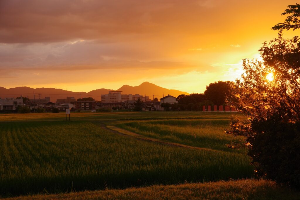 奈良県橿原市の藤原宮跡からは大和三山が見渡せて、歴史の舞台でありながら素朴でのどかな場所です。この日は夕刻に訪れ、夕焼けに染まる二上山が美しかったので夢中で撮りました。